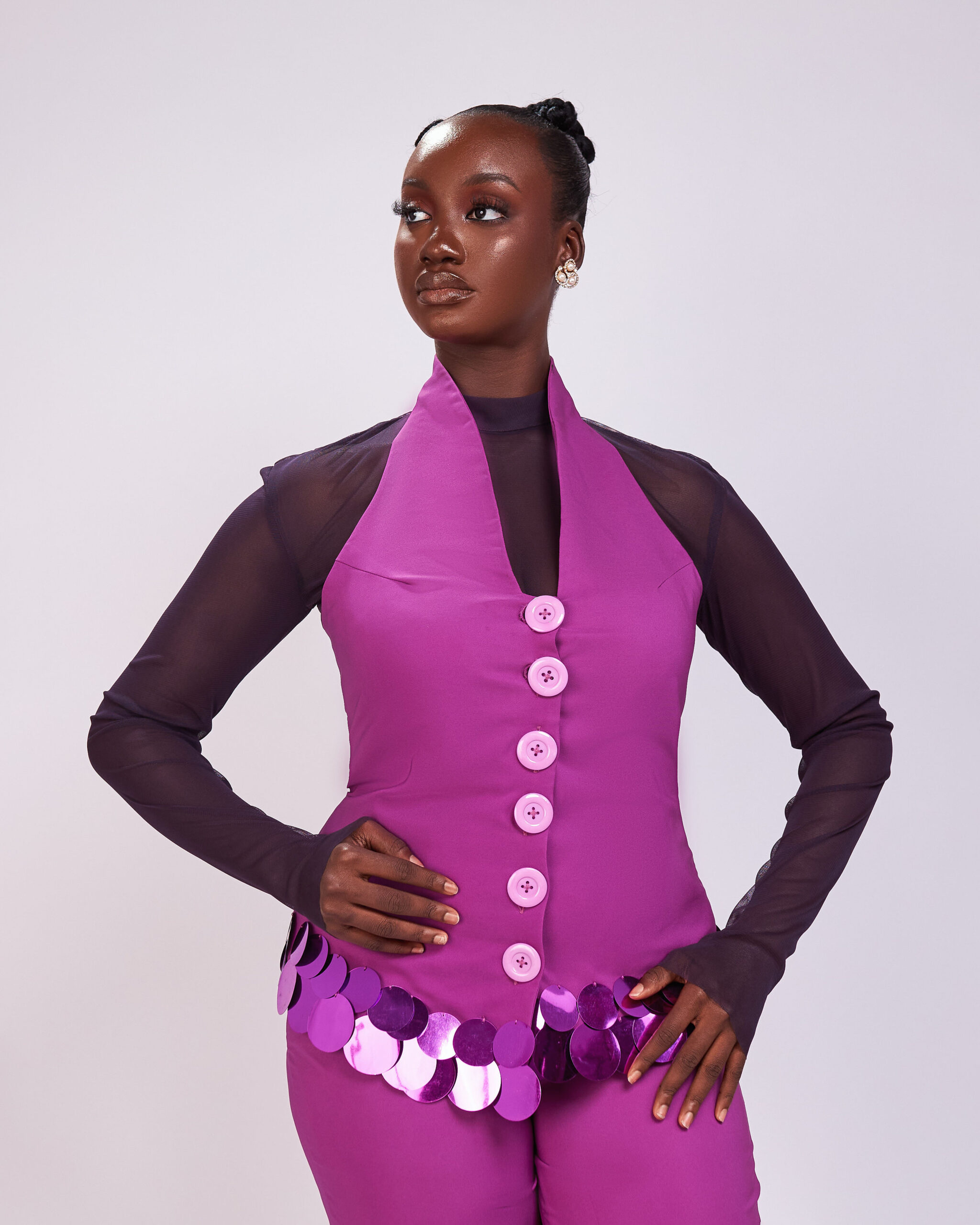 The vibrant Gemini Jacket Set strikes the perfect balance between professional polish and playful sophistication. The ensemble features tailored work pants that provide a sleek, structured fit ideal for office wear, paired with a statement jacket adorned with bold sequin detailing around the waistline adding just the right touch of sparkle and personality.