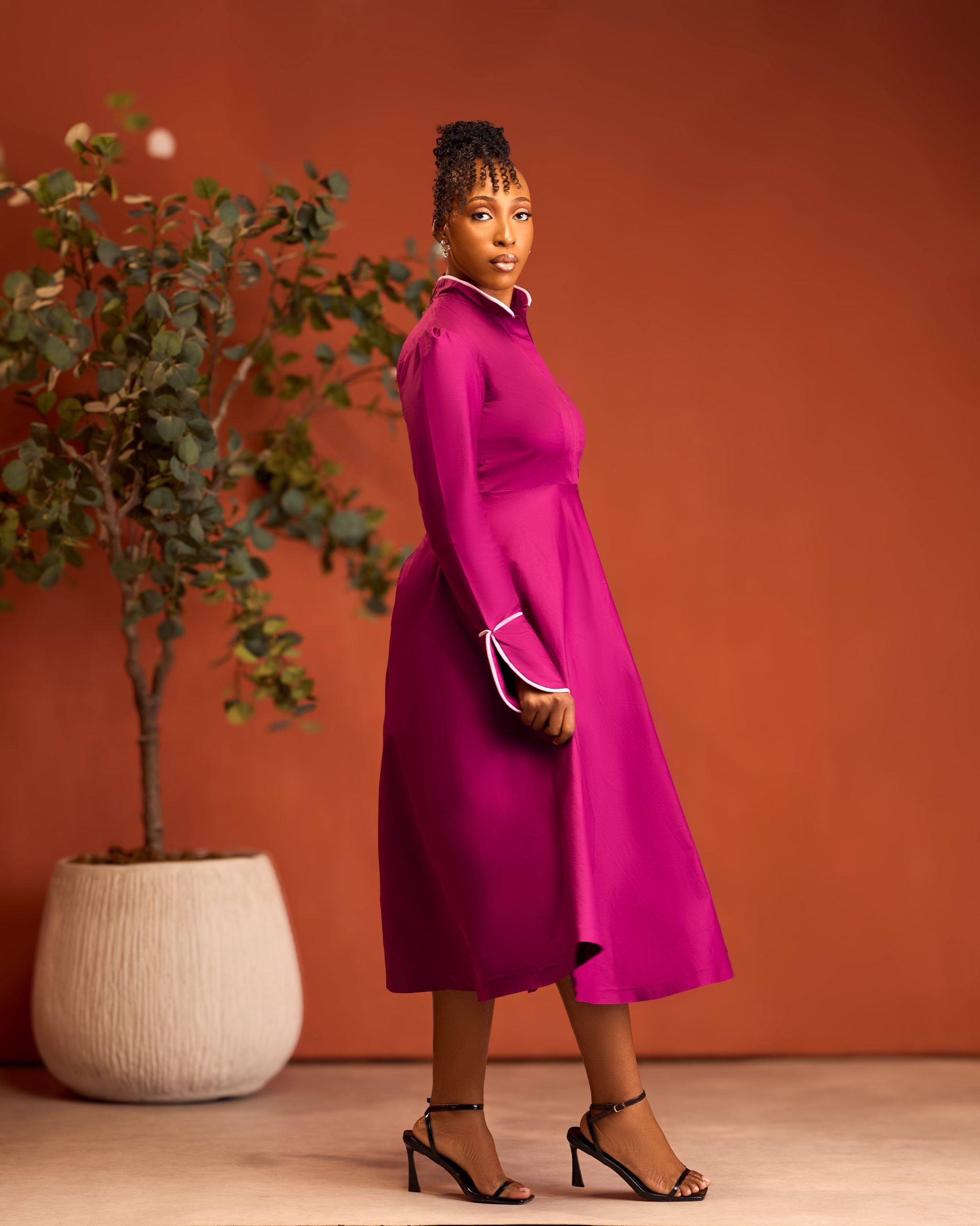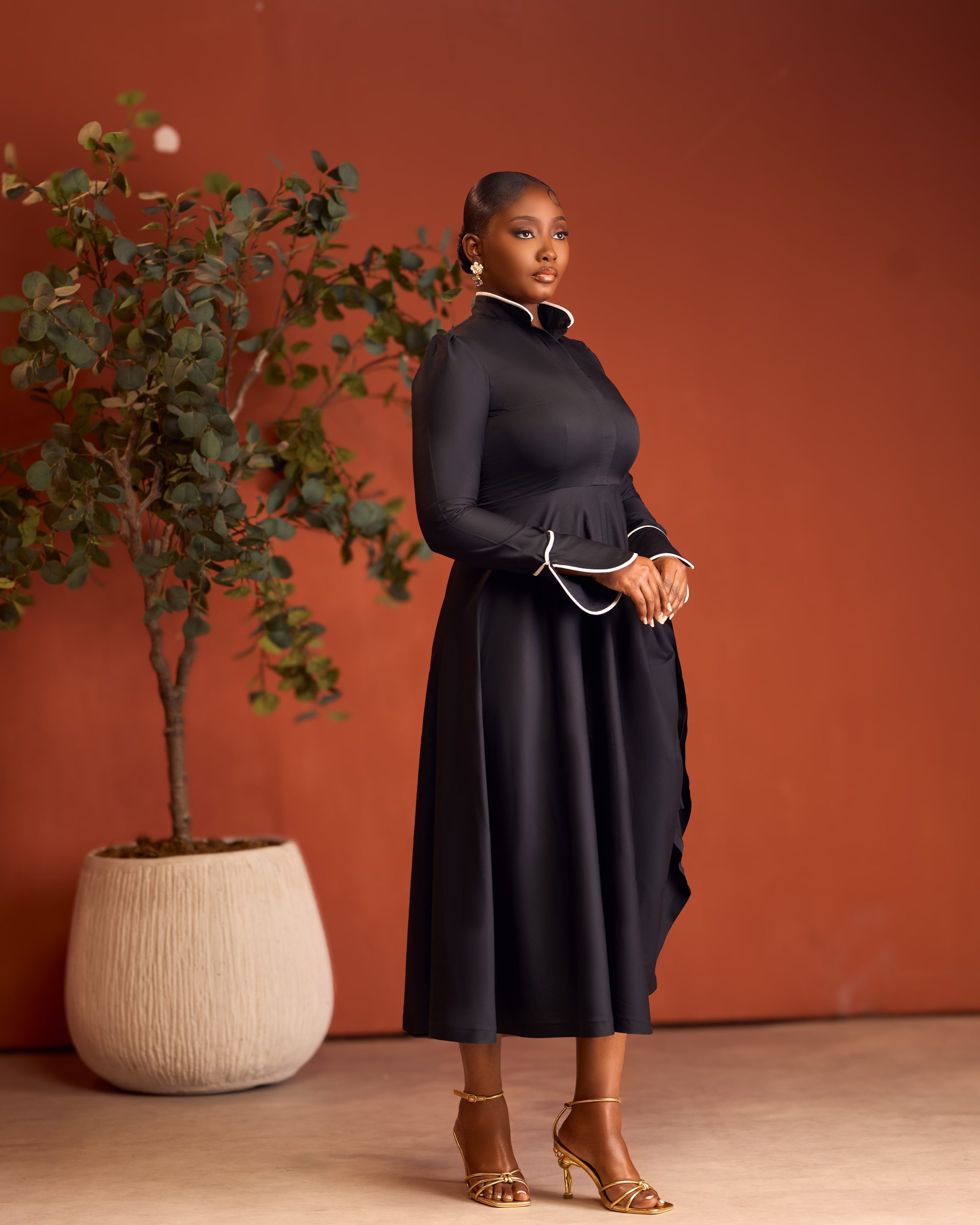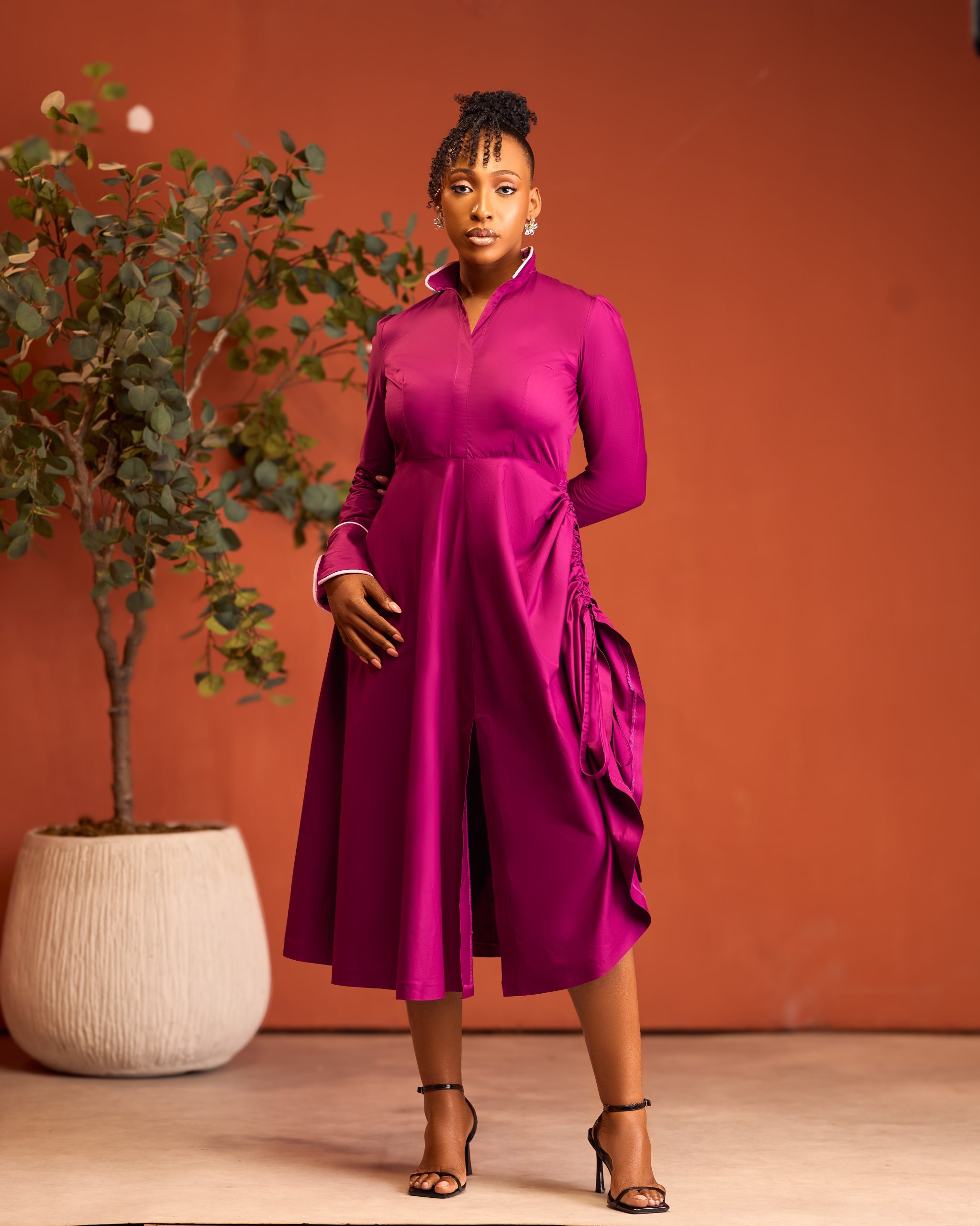 The high-neck detailing and front slit add a touch of modern femininity, while the adjustable ruched sides ensure a flattering fit for every body type. Ideal for church, brunches, or special occasions where class speaks louder than words, the Katherine dress transitions seamlessly from day to evening.