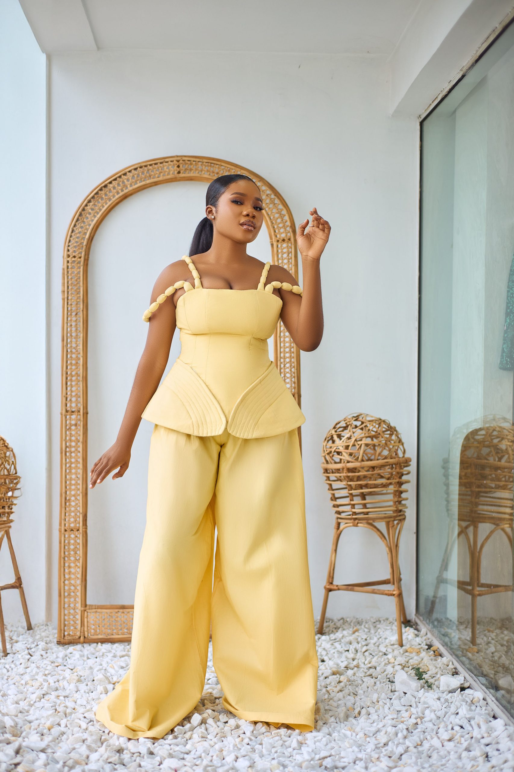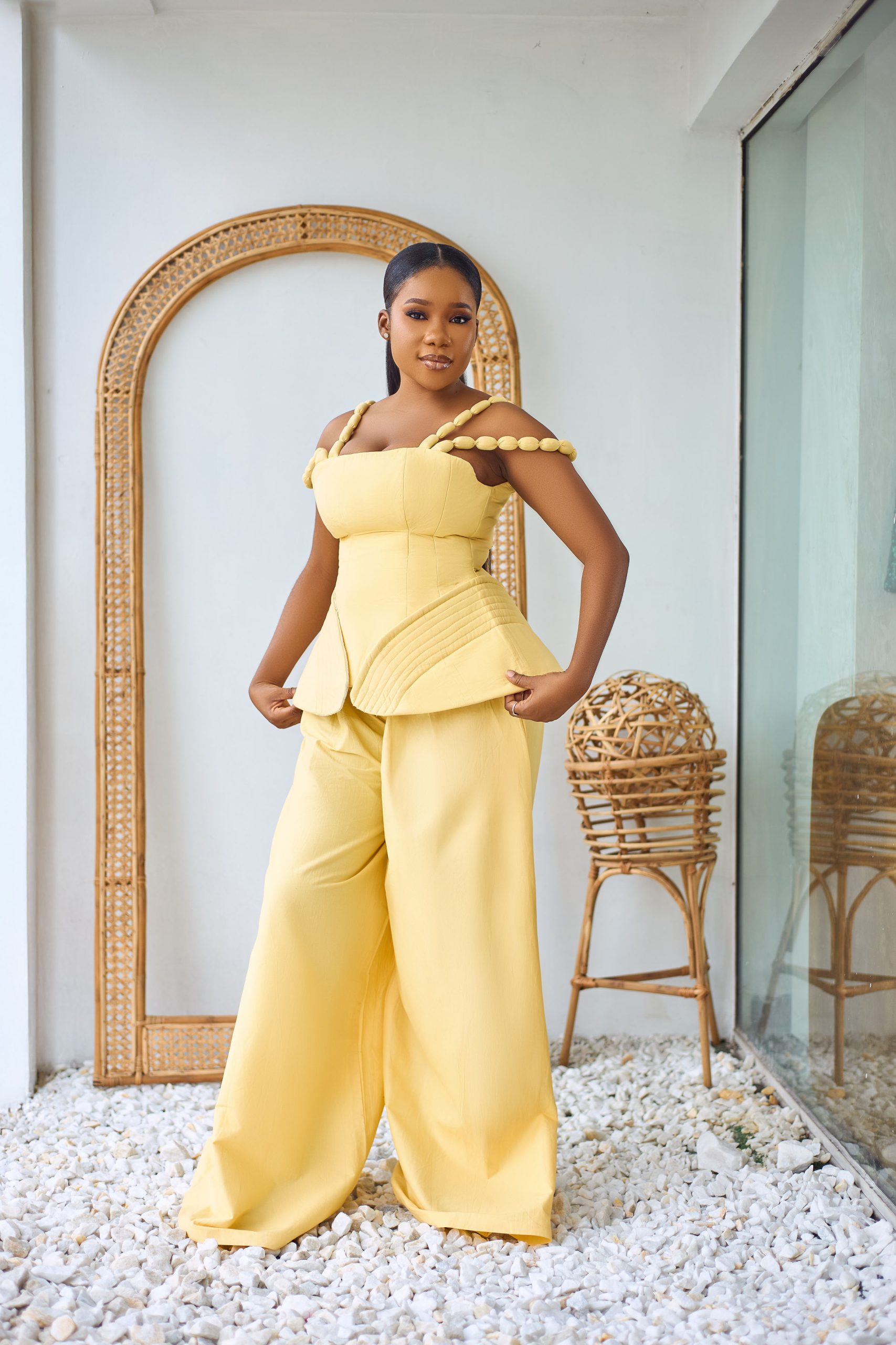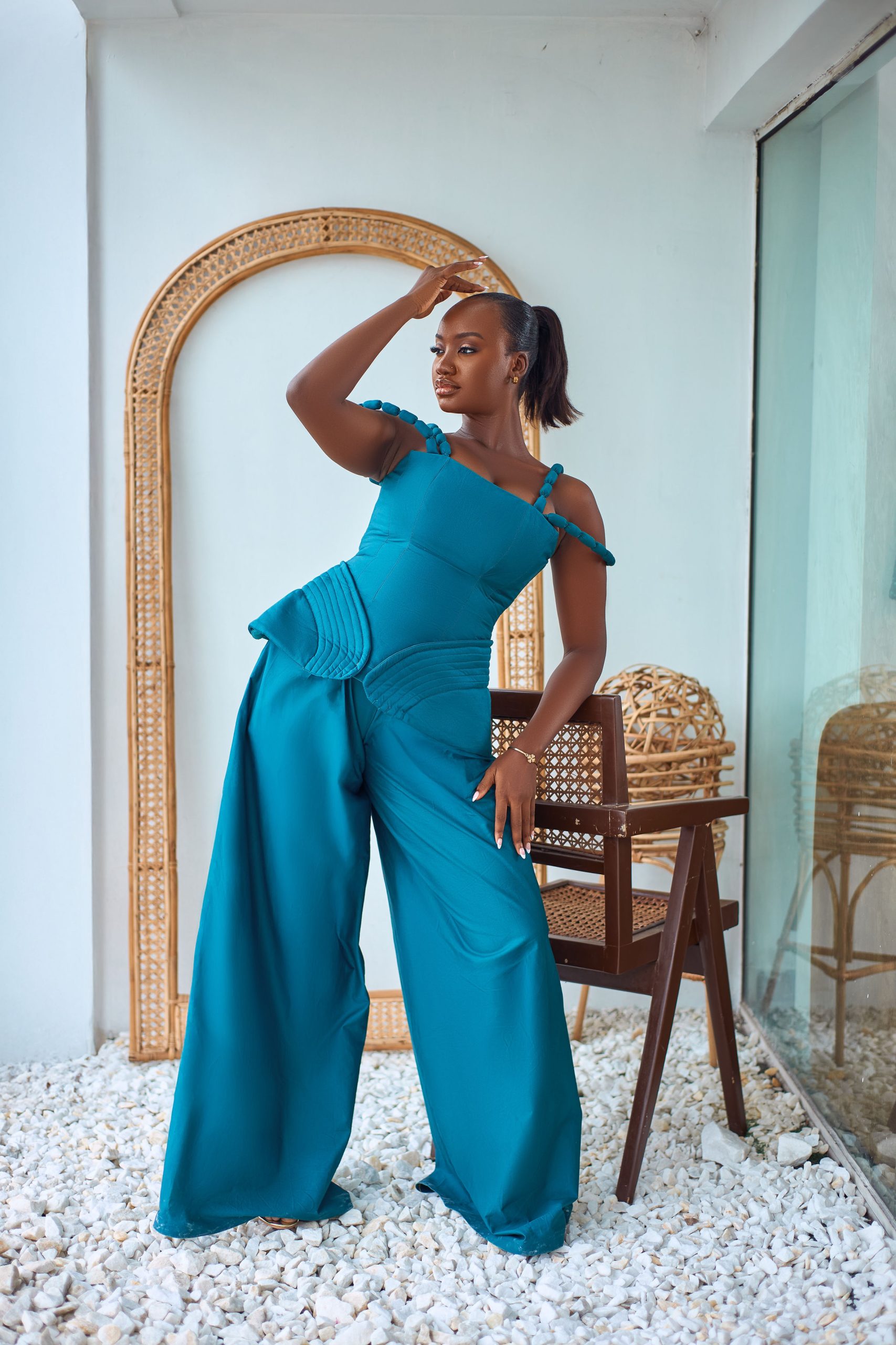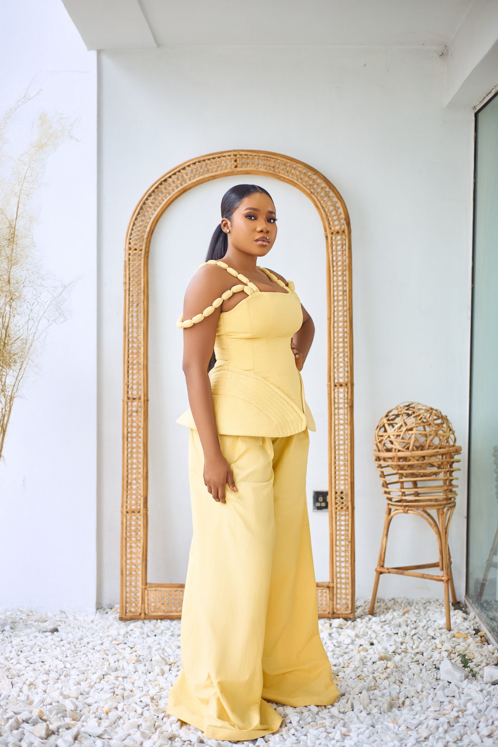 Paired with wide-leg trousers that exude effortless sophistication, this set balances confidence and comfort, giving a fluid, graceful flow with every step.