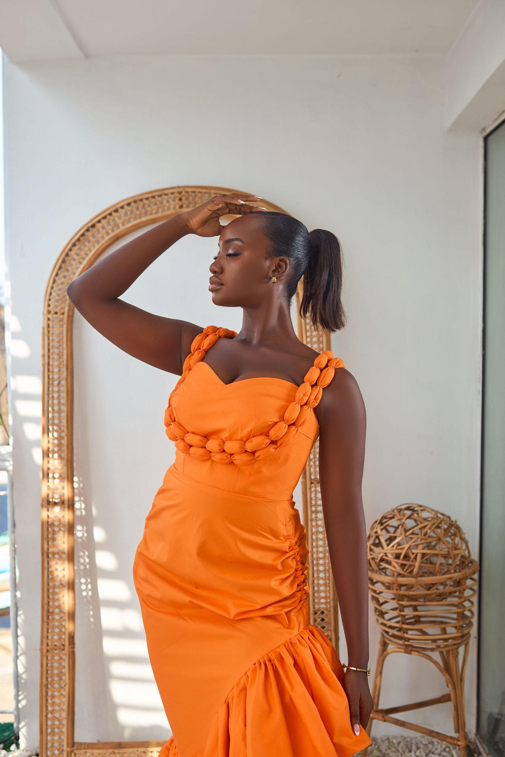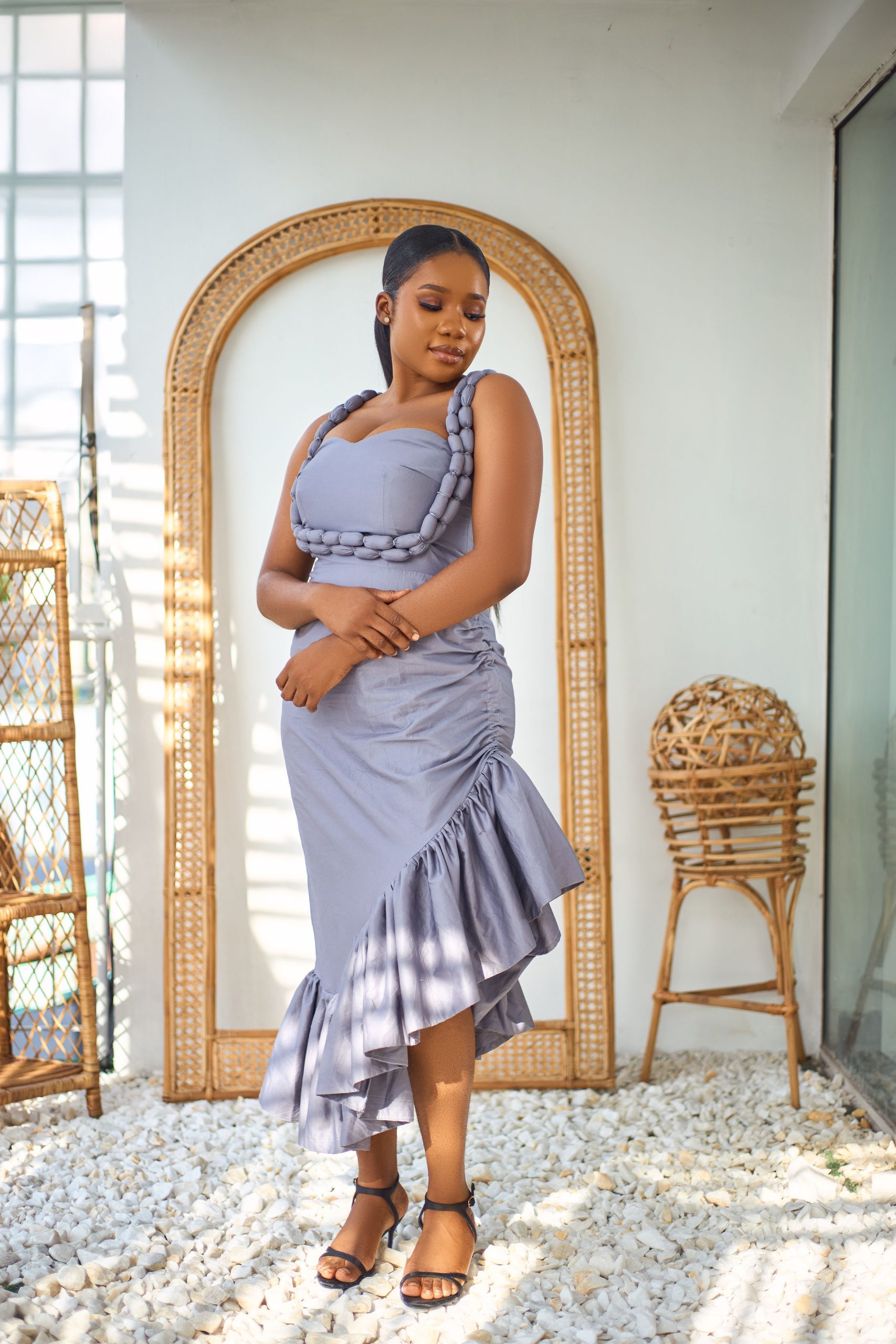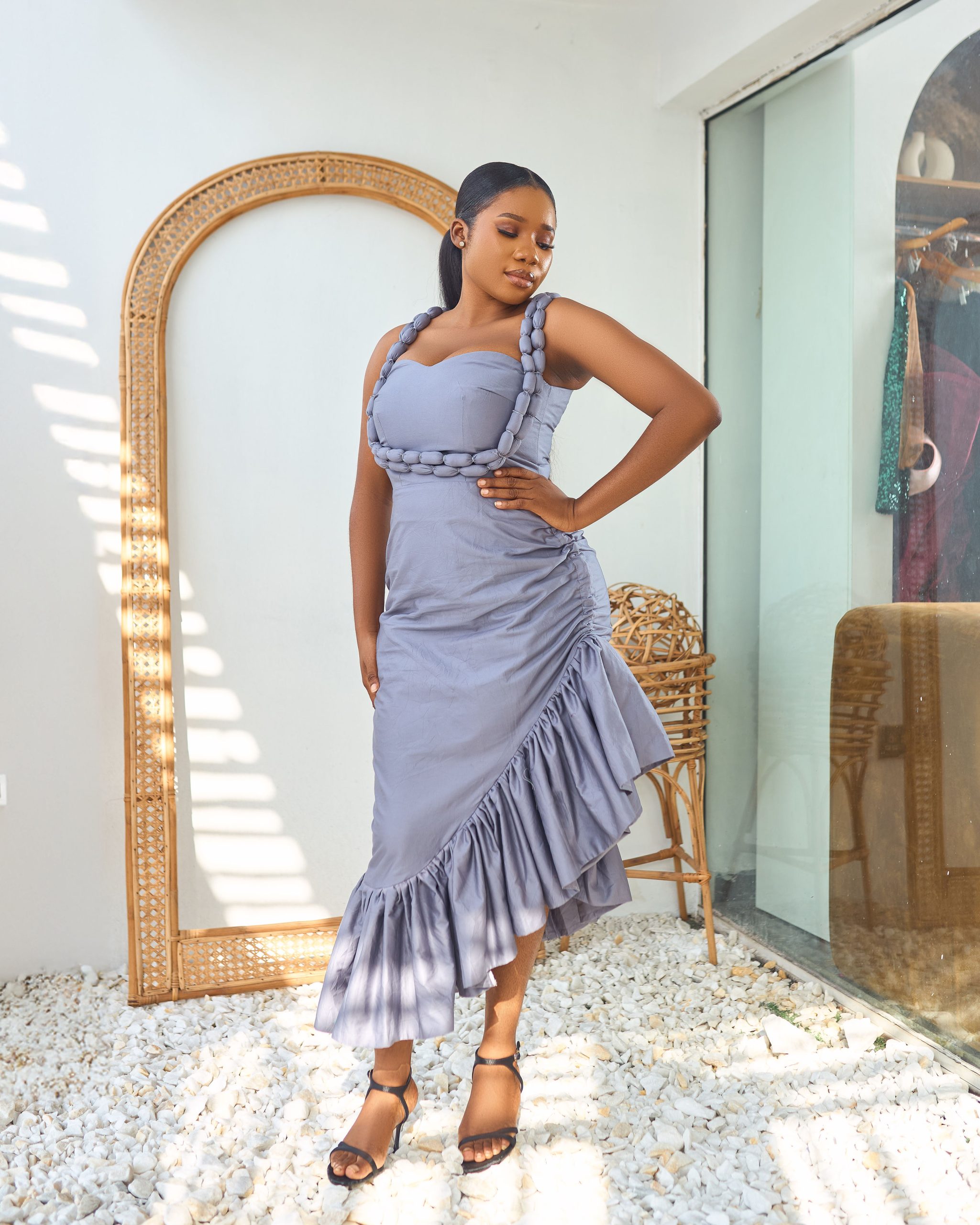 Finished with a playful ruffled hem, the dress brings soft movement and elegance to every step. Available in vibrant colors that complement every skin tone, it’s the perfect look for stylish celebrations and standout moments.